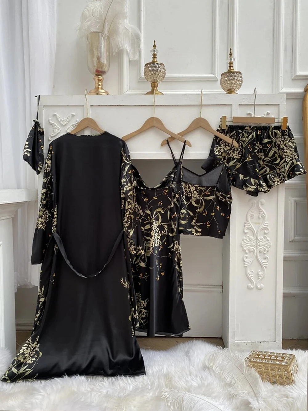 Комплектация: халат, пеньюар, пояс, шорты и майка. Бретельки регулируются по высоте.